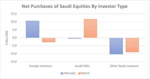 Second, the market has been supported by equity purchases by government-related enterprises (specific institutions involved are not disclosed). These have offset sales by Saudi individual investors and to a lesser extent by foreign investors. Sales by the latter followed the surge in their purchases in February after restrictions on foreign investor participation in the Saudi markets were eased.