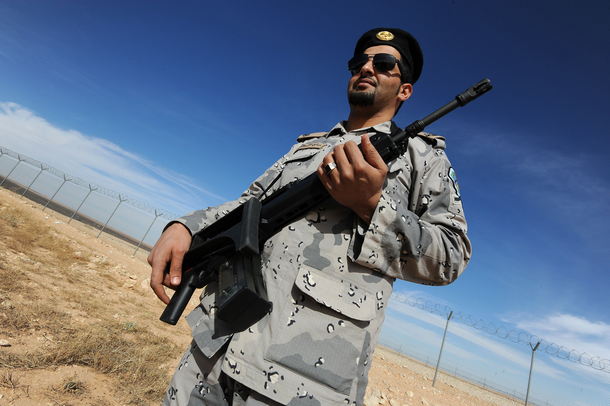 'A member of the Saudi border guards forces patrols the fence on Saudi Arabia's northern border with Iraq, near Arar City. (FAYEZ NURELDINE/AFP/Getty Images)'