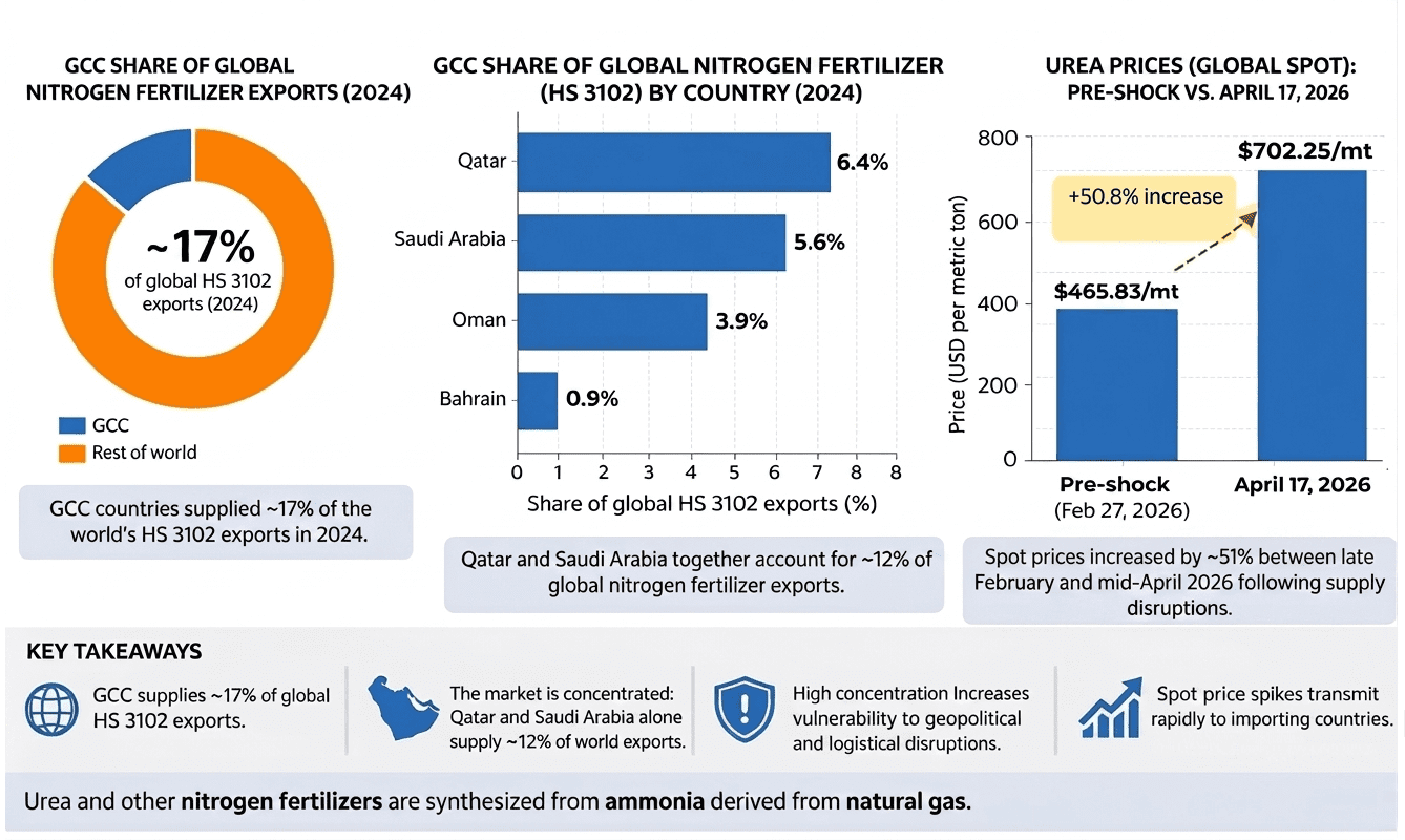 The disruption also feeds back to the Gulf itself, highlighting the structural paradox at the heart of GCC food security. The GCC states simultaneously dominate global fertilizer exports and depend on the same maritime corridor for 80% to 90% of their own food imports. The collapse of shipping flows therefore threatens both the region’s economic role as the world’s nitrogen corridor and its nutritional security as a food-importing region. The resilience of the Strait of Hormuz is not merely a trade concern; it is a precondition for the region’s continued ability to feed itself.