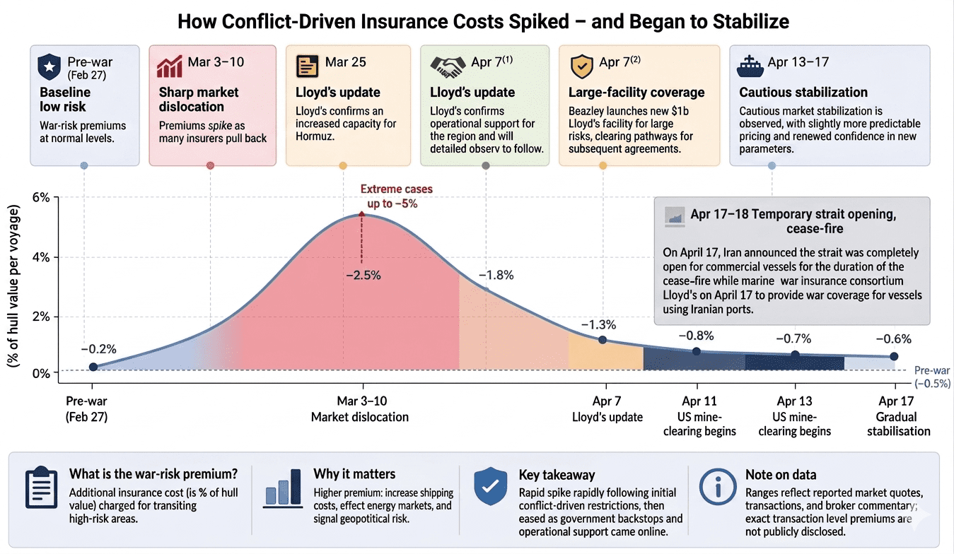 The two-week cease-fire announced April 7, conditioned on Iran’s reopening of the strait, did not normalize insurance conditions, showing how the insurance mechanism operates with a logic and timeline independent of battlefield developments. Subsequent U.S. diplomatic engagement and preliminary discussions involving the U.S. International Development Finance Corporation and insurers have not yet translated into normalized insurance pricing or restored commercial shipping volumes to preconflict levels. The developments of April 17-18 illustrated this gap. On April 17, Iran announced the strait was completely open for commercial vessels for the duration of the cease-fire, triggering a drop of more than 10% in oil prices and a rally in global equity markets. However, shipping companies declined to move: The route declared open covered only about one-third of the full strait due to mines and military blockades still in place, mandatory coordination with Islamic Revolutionary Guard Corps forces was required, and insurance rates remained approximately 300% above preconflict levels, with insurers explicitly not ready to sound the all clear. The opening lasted less than 24 hours: On April 18, Iran reinstated control of the strait in response to the U.S. refusal to lift its naval blockade of Iranian ports. IRGC gunboats fired on at least one tanker near the strait hours after the reclosure announcement. The cease-fire itself expires in just days, and President Donald J. Trump has indicated it may not be extended. Insurance market conditions as of April 18 reflected this volatility: War-risk premiums remained sharply above peacetime baselines, and while Beazley announced a new $1 billion Lloyd’s marine war consortium on April 17 to provide additional hull and cargo war coverage capacity for Strait of Hormuz transits, the April 17-18 cycle of opening and immediate reclosing has not restored market confidence. Insurance constraints will therefore persist until a final and verifiable peace agreement is in place.