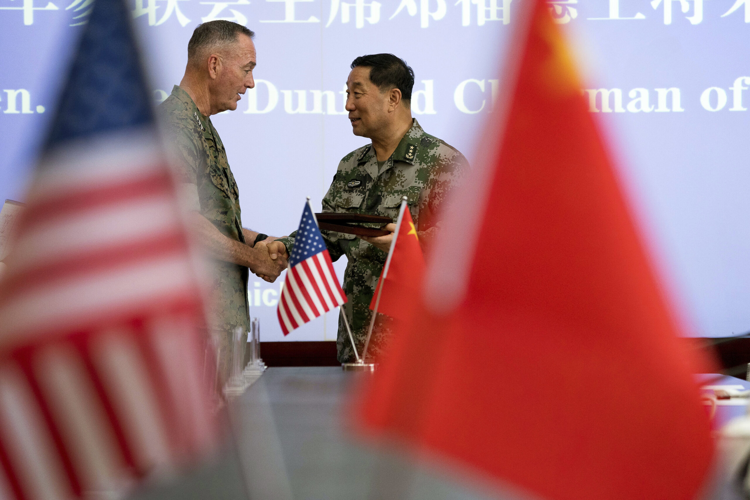 رئيس هيئة الأركان المشتركة الأمريكية الجنرال جوزيف دانفورد، يسارًا، يصافح قائد الجيش الشمالي الصيني الجنرال سونج بوكوان، يمينًا، بعد اجتماع في معسكر هايتشونج لقيادة الجيش الشمالي في هايتشونج بالصين 16 أغسطس 2017. (صورة من أسوشييتد برس/أندرو هارنيك)