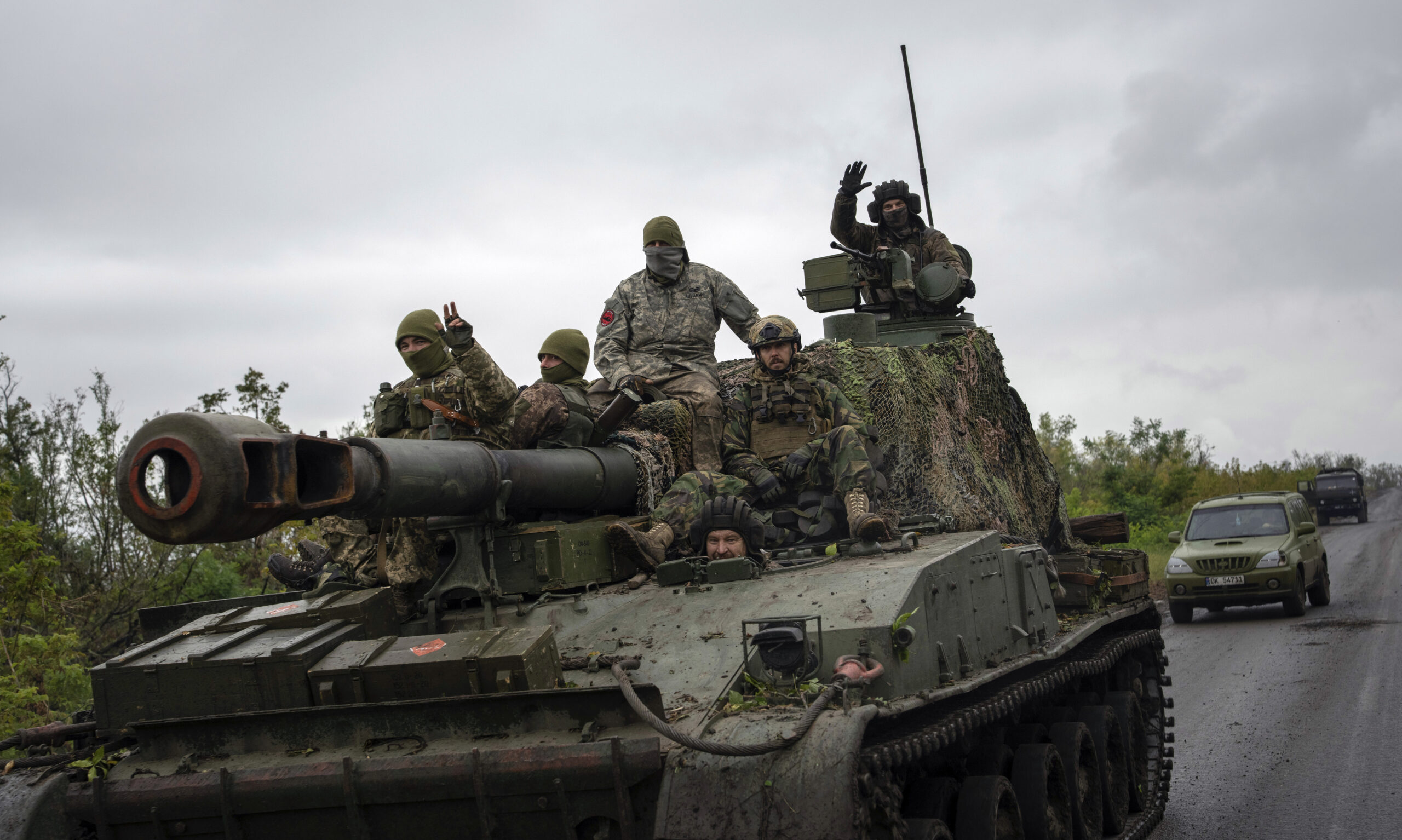 جنود أوكرانيون يقودون مركبة مدفعية ذاتية الدفع في منطقة دولينا التي تم استعادتها مؤخرًا، منطقة دونيتسك، أوكرانيا، 14 سبتمبر 2022. (صورة من أسوشييتد برس/إيفجيني مالوليتكا)