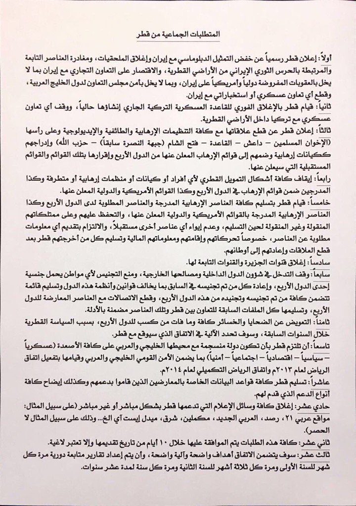النسخة المسربة لقائمة مطالب الدول الأربعة المقاطعة لدولة قطر والتي قامت الكويت بتسليمها للدوحة مؤخرا