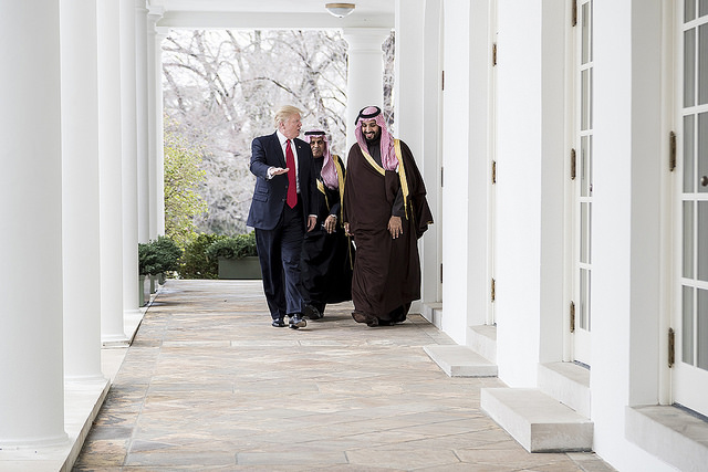 الرئيس دونالد ترامب يسير مع محمد بن سلمان بن عبدالعزيز آل سعود، نائب ولي العهد ووزير الدفاع في المملكة العربية السعودية، على طول الرواق الغربي للبيت الأبيض، الثلاثاء، 14 مارس / آذار 2017. (البيت الأبيض الرسمي لشيالة كريغهيد)