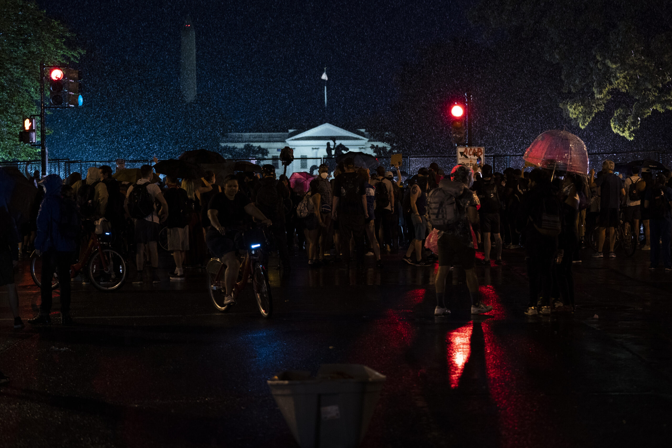 مساء ذلك اليوم شاهد الأميركيون طائرة مروحية، تحلق على علو منخفض وخطير، بين شارعين في المدينة لترهيب المتظاهرين. وللمرة الأولى، قامت السلطات الفدرالية بنشر عناصر أمنية مقنعة في أماكن عديدة في واشنطن، من بينها أمام النصب التذكاري للرئيس ابراهام لينكولن، دون أن يضعوا على بذاتها أي اشارت حول هويتها، ما عزز الشكوك بأنها عناصر تابعة للشرطة السرية للبيت الأبيض. وهذه هي المرة الأولى التي تنشر فيها مثل هذه العناصر الأمنية، الأمر الذي دفع ببعض المعلقين لوصفها بأنها جهاز استخباراتي سري، مماثل لأجهزة الاستخبارات السرية في الدول غير الديموقراطية.