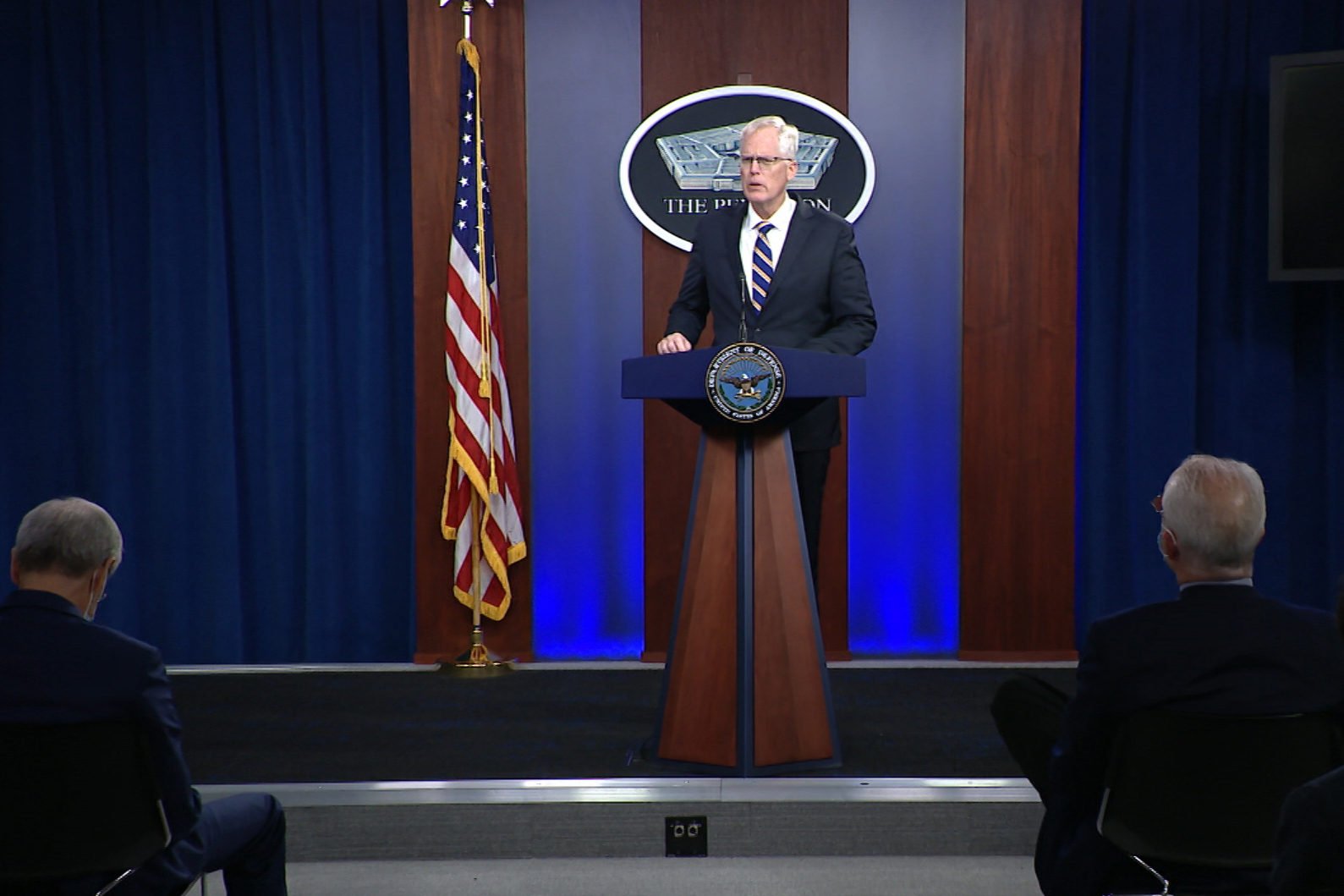 كريستوفر ميلر، وزير الدفاع الأمريكي بالوكالة، يتحدث في البنتاجون عن قرار تخفيض القوات الأمريكية في العراق وأفغانستان، 17 نوفمبر 2020. (وزارة الدفاع الأمريكية/صورة من أسوشييتد برس)