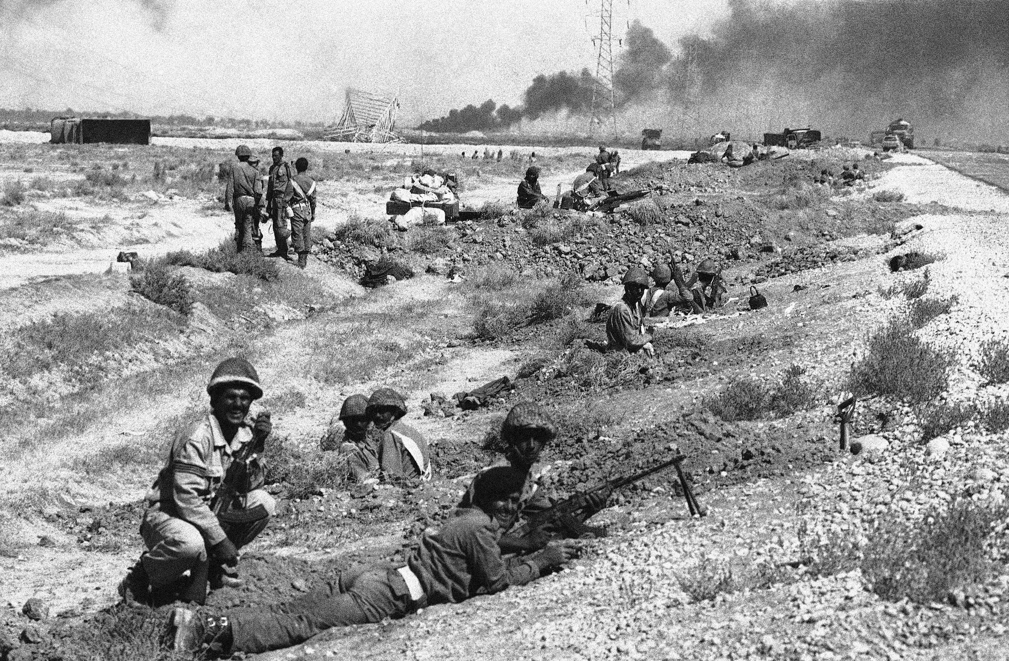 قوات عراقية في إيران متخندقة على طول الطريق السريع الذي يربط عبادان بخرومشهر، 19، أكتوبر 1980. (اسوشيتدبرس/هينداني)