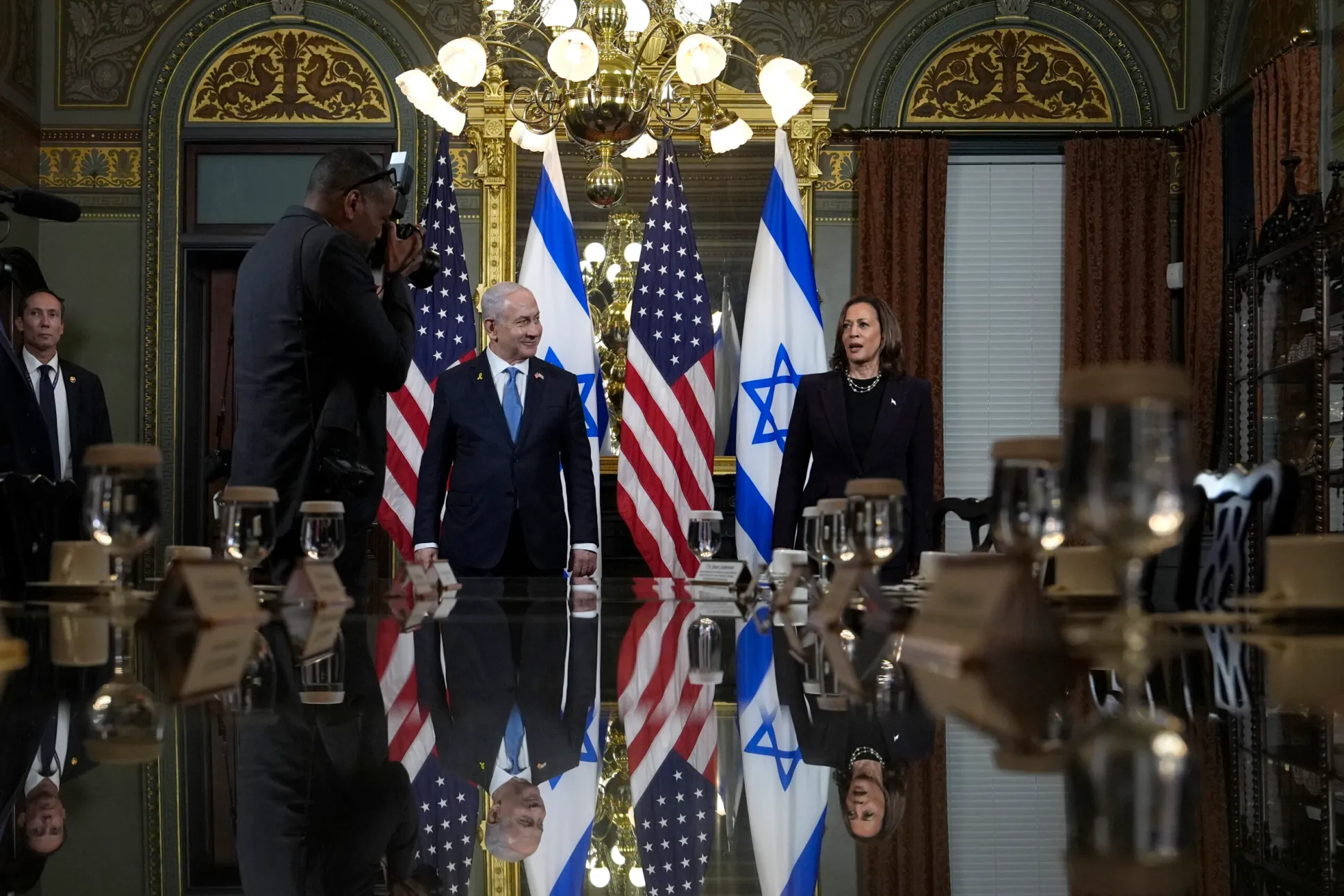 وخلال الأسبوع الأخير من يوليو/تموز، زار رئيس وزراء إسرائيل بنيامين نتنياهو واشنطن، ليّذكر الطبقة السياسية بحزبيها بأنها متورطة في حروب إسرائيل ضد أعدائها في الشرق الأوسط. سعى نتنياهو لتعبئة الحزب الجمهوري بالتحديد (رئيس مجلس النواب الجمهوري مايك جونسون هو الذي دعا نتنياهو لمخاطبة مجلسي الكونغرس) وراء موقفه المتصلب من دعوات وقف إطلاق النار، والتعجيل بعملية تبادل الرهائن الإسرائيليين والأسرى الفلسطينيين، والبدء بمعالجة المأساة الإنسانية الهائلة المتمثلة بأكثر من مليوني فلسطيني مقتلع في قطاع غزة. التقى نتنياهو بالرئيس بايدن وكامالا هاريس في اجتماعين منفردين.